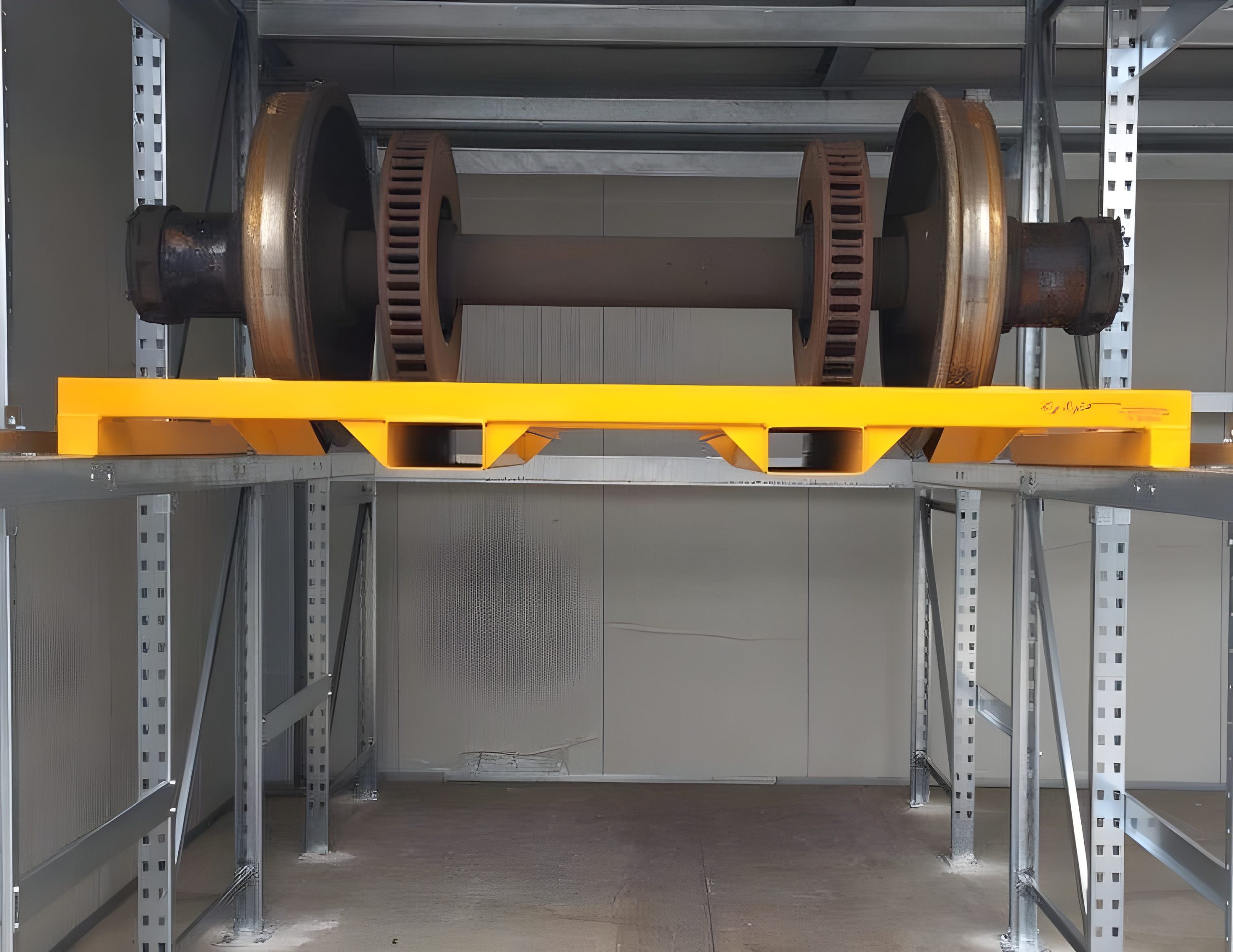 Staplingsramar används för säker och platsbesparande lagring av boggier och hjulaxlar i depå- och verkstadsmiljöer. Den robusta konstruktionen möjliggör stabil stapling i flera nivåer, vilket effektiviserar lagerhantering och optimerar användningen av tillgänglig golvyta.